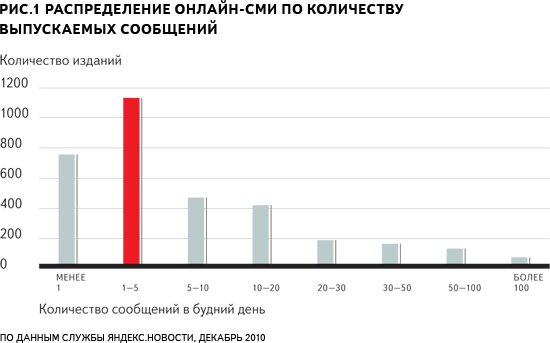 По данным Яндекс.Новостей на январь 2011, каждый будний день СМИ рунета публикуют не менее 50 тысяч новостей, каждый выходной - не менее 15 тысяч. 80% этого потока генерируют всего 20% крупных изданий.