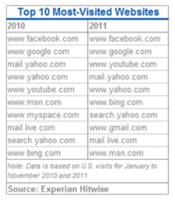 Также эксперты из агентства Experian Hitwise составили рейтинг посещаемости ресурсов пользователями из США, в котором Facebook снова стал лидером, за год увеличив свою посещаемость на 15 %. Второе место досталось Google.com увеличившему посещаемость на 7 %, следующим по популярности стал видеохостнг YouTubе. Yahoo Mail в этом году сместился на одну строчку вниз по сравнению с 2010 годом, аналогично повел себя и Yahoo.com, оказавшийся на пятой строчке рейтинга.