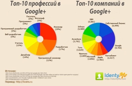 Если же говорить о том, как распределились пользователи Google+ по своей профессиональной принадлежности, отметим, что первое место заняли инженеры – их в социальной сети 29%. На втором месте оказались разработчики – их 17%. Третью позицию в рейтинге занимают учителя, численность которых в соцсети составила 15%. Следом за ними идут дизайнеры – 14%. Также в Google+ «зависает» 12% программных инженеров и по 5% веб- и программных разработчиков, программистов, писателей и фотографов.