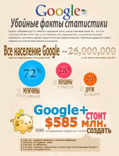 Как сообщается в русскоязычном блоге, посвященном социальной сети Google+, на сегодняшний день соцсеть насчитывает более 26 млн. зарегистрированных пользователей. При этом, их численность поступательно растет. Самым популярным участником сети является Марк Цукерберг (Mark Zuckerberg). Над Google+ трудится 500 различных специалистов, а 55% пользователей социалки живет в США.