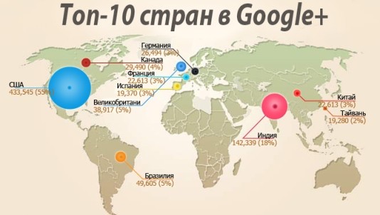 Примечательно, что рейтинги стран, в которых популярна соцсеть, распределились следующим образом: первое место занимает США, население которой составляет 55% пользователей соцсети. Следом за Америкой идет Индия с 18% пользователей Google+. Третье место разделили Великобритания и Бразилия с 5% пользователей соцсети. На четвертом расположилась Канада - 4% от общего числа пользователей. Далее следуют Китай, Германия, Франция, Испания – в каждой стране насчитывается по 3% от общего числа пользователей Google+. Завершает десятку Тайвань с 2% пользователей соцсети. Отметим, что Россия в топ-10 стран-пользователей соцсети не вошла.