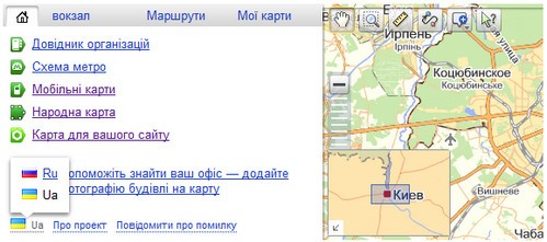 Теперь, если в настройках браузера или на главной странице Яндекса пользователем выбран украинский язык, то и Яндекс.Карты будут показаны ему на украинском. Сами схемы останутся, как и прежде, с подписями на двух языках. Причем в любой момент можно переключиться с одного языка на другой с помощью кнопки в левом нижнем углу страницы.