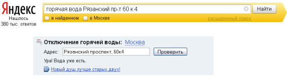 Чтобы узнать, когда отключат горячую воду в его доме, пользователю остается лишь ввести запрос [горячая вода], подставив рядом название интересующей улицы и номер дома: