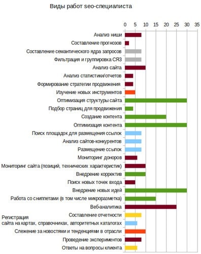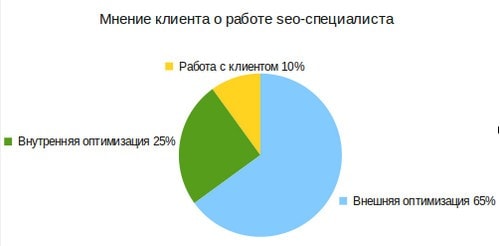 Многие клиенты seo-услуг представляют распределение времени работы специалиста по продвижению проекта примерно в следующем соотношении: