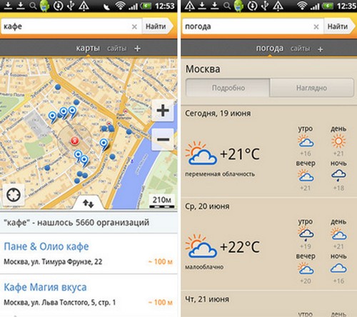 Так, по запросу [кафе] владельцы телефонов на Android сразу увидят карту с ближайшими заведениями, а по запросу [погода выходные] - прогноз: