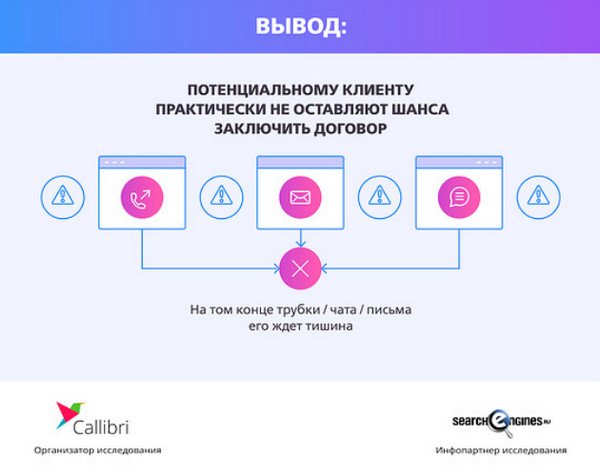 Исследование показывает, что большинство бухгалтерских компаний безразличны к удобству канала связи для клиента. Также бухгалтерские компании нерационально относятся к собственному рекламному бюджету и эффективности, так как не отключают неработающие каналы связи в нерабочее время. Половина компаний указывает на сайте мобильный номер телефона, что не вызывает доверия у клиента, а 1,4% вовсе не указывают этот канал коммуникации.