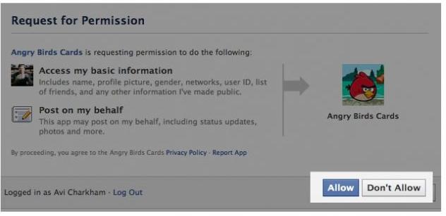 В старой версии оформления, Facebook использовал две кнопки - «Принять» или «Отклонить», что автоматически ставило пользователя перед выбором и соответствующим решением. Новый App Center Facebook оснащён только одной кнопкой. Ни выбора, ни решения. Один клик и, привет, готово! Ваша информация передана разработчикам приложения, а вы того и не заметили.