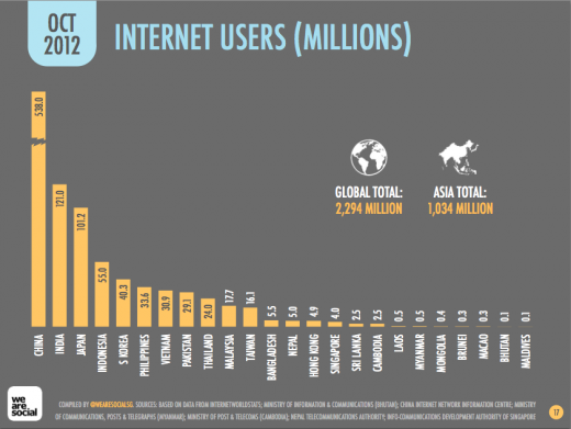 Согласно данным последних исследований, жители азиатского региона составляют более 45% от числа пользователей сети интернет по всеми миру, при этом абсолютное число пользователей сети в Азии составляет 1,03 миллиарда человек (на конец прошлого года эта цифра составляла 909 миллионов).