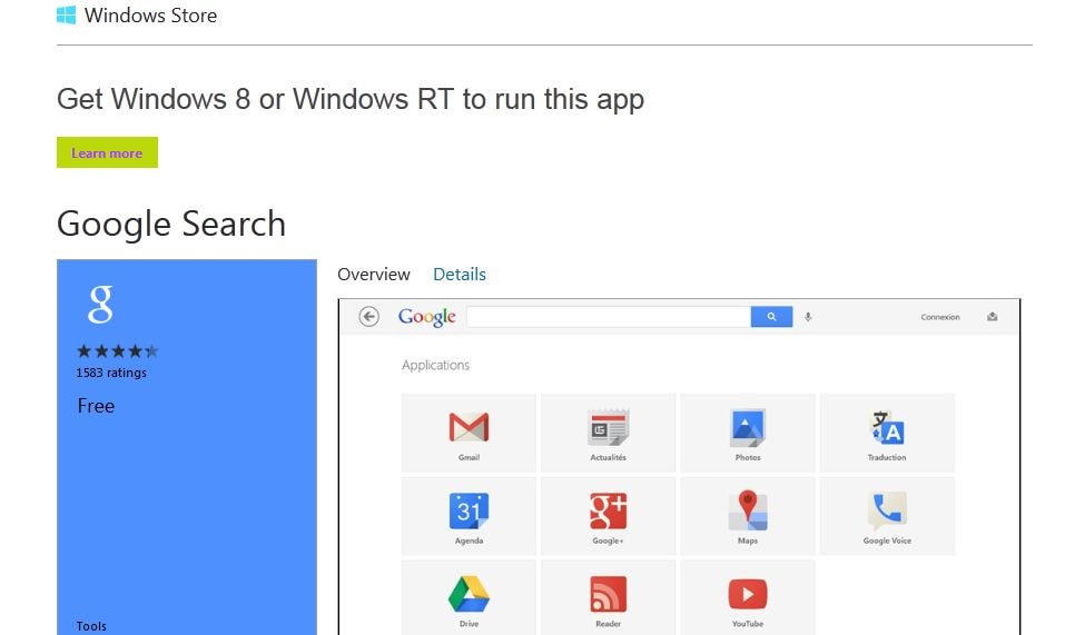 Помимо поиска, приложение позволяет просматривать ролики с YouTube, а также предлагает ссылки на Gmail, Google Карты, Google+, Google Drive и другие приложения поискового гиганта. В функционал приложения входи и голосовой поиск. Google Search под Windows RT доступно для скачивания по .