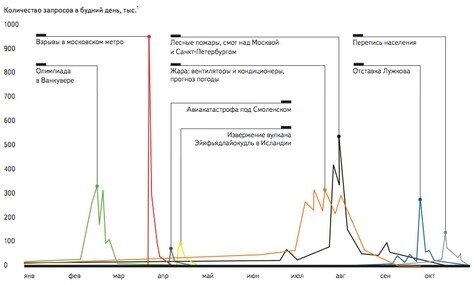 Судя по запросам к поиску Яндекса, 2010 год запомнится, в том числе, летней жарой и пожарами, Олимпиадой в Ванкувере, отставкой московского мэра и взрывами в метро.