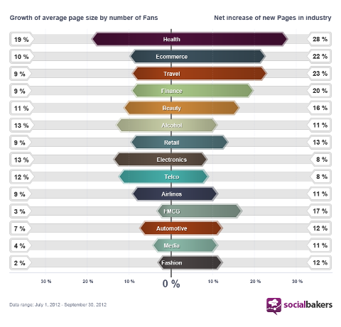 Здоровье и путешествия являются наиболее динамично развивающимися отраслями: в 3 квартале было добавлено 28% и 23% новых страниц Facebook.