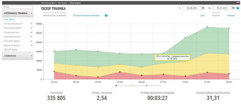 В отличие от обычных счетчиков, сервис не только собирает информацию о посетителях, но и автоматически анализирует ее. Система решающих правил, основанная на эвристических алгоритмах, принимает решение по каждому посетителю: считать его качественным или нет. Пользователям системы BotScanner не нужно разбираться в веб-аналитике или тратить свое время, чтобы сделать выводы о качестве трафика с конкретного рекламного канала – эту работу берет на себя система, предоставляя наглядную картину распределения качества трафика по дням, рекламным каналам, поисковым запросам и т.д: