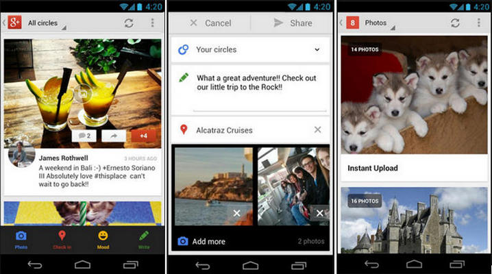 Во-вторых, был значительно улучшен фотосервис Google+: появился бесплатный бэкап пользовательских фотографий до 5 ГБ без ограничения размера снимков, а также был добавлен сервис просмотра круговых панорам для мобильных устройств. Создавать панорамы можно только на Android 4.2 и выше, но просмотр доступен любому пользователю с операционной системой от Google.