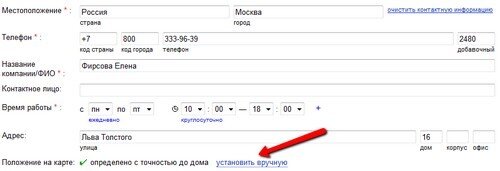 Для того чтобы изменить или уточнить свое местоположение на карте, необходимо при заполнении формы с контактными данными «Адрес и телефон» кликнуть на ссылку «установить вручную» и передвинуть метку на карте в нужную точку.