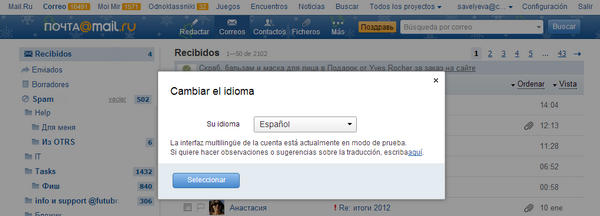 Включить испанскую версию интерфейса можно в футере любой страницы Почты или в разделе «Настройки пользователя» - «Интерфейс почтового ящика»: