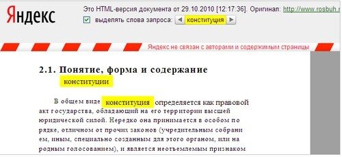 Найденные слова запроса выделяются в тексте, по ним можно перемещаться с помощью специального элемента управления в верхней части страницы. Там же указана дата документа и размещена ссылка для быстрого перехода на оригинал страницы.