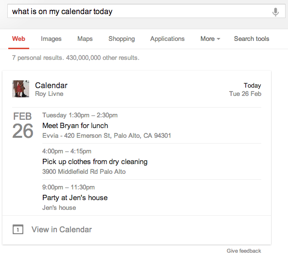 Ряд пользовательских запросов на Google.com теперь тоже выдают соответствующие записи из Calendar, позволяющие общаться с ежедневником «по-человечески».