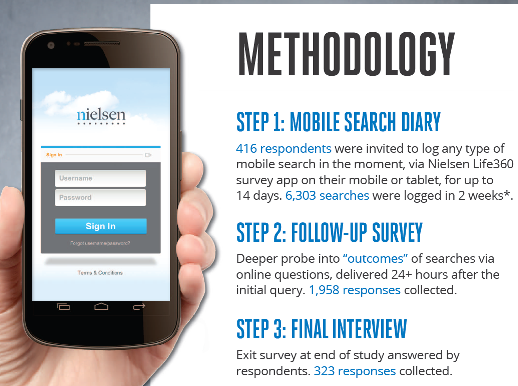 Для обеспечения достоверности исследования представители Google попросили владельцев более, чем 6 000 мобильных устройств зарегистрироваться в специальном приложении, которое позволяло исследователям фиксировать все действия, совершаемые пользователем в процессе и по завершении мобильного поиска. На следующем этапе исследователи опросили 1 958 респондентов и сопоставили результаты мобильного поиска с уровнем конверсии, которую обеспечили продающим сайтам данные пользователи. Всю полученную информацию скорректировали в ходе заключительных персональных интервью с пользователями.