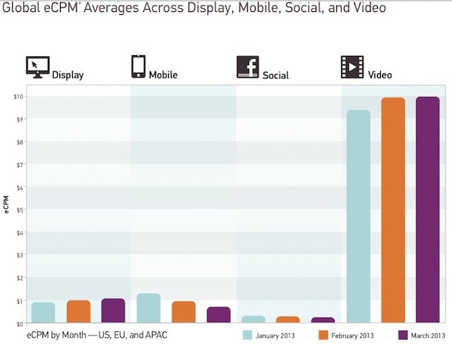 Итак, между январем и мартом этого года средний показатель eCPM для видеорекламы вырос на 6.16% с $9.41 по $9.99. Дисплейный eCPM вырос с $0.92 до $1.06, что составляет 15.2%. По словам аналитиков Turn, этот рост отражает желание рекламодателей «гарантировано достичь аудитории через знакомые, широкоформатные каналы».