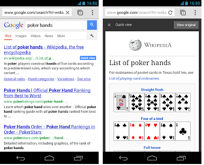 Однако представители Google предупреждают, что данная функция в мобильной версии поиска является экспериментальной и в настоящее время доступна лишь для англоязычных страниц Wikipedia при просмотре в зоне Google.com. Кроме того, разработчики трудятся над добавлением функции быстрого просмотра и для страниц других сайтов. В случае одобрения тестовой группой пользователей, функционал будет интегрирован в мобильное поисковое приложение Google.