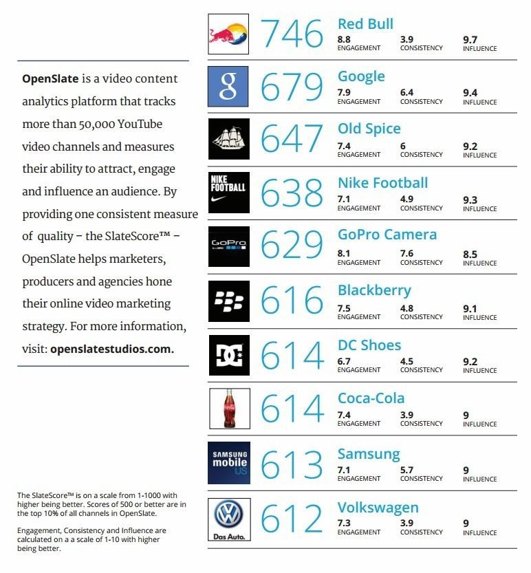 Первые 500 брендов генерируют 442 миллиона просмотров YouTube в месяц, примерно по 884,000 каждый, говорится в отчете аналитической компании Outrigger Media. При помощи анализа данных работы платформы Open Slate также было показано, что количество подписчиков на каналы брэндов намного ниже количества подписчиков на каналы Twitter — 35,000 против 200,000, соответственно.