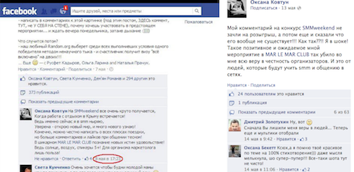 MAR LE MAR CLUB разыгрывал визы "все включено" на двоих на трехдневное мероприятие SMMweekend. Во время дискуссии участники обсудили новый алгоритм отображения комментариев к постам в Facebook, действие которого обнаружилось при проведении этого конкурса, который начал скрывать отдельние посты, и еще не до конца понятно, по какому принципу. Вопрос обсуждается не только у нас, но и на англоязычных ресурсах.
