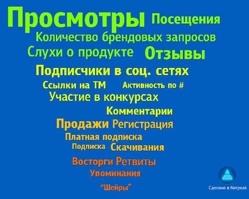 Метрики и оценки эффективности можно построить в виде воронки продаж. На каждом этапе есть определенные метрики, от зеленого к красному: знание торговой марки (зеленый), интерес к марке (желтый), конверсии (оранжевый) и лояльность — восторги, ретвиты, упоминания, шейры (красный).