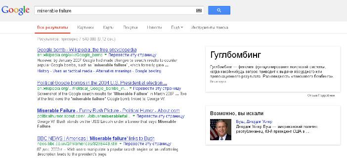 Очевидно, что «возрождение традиции» связано с запуском алгоритма семантического поиска «Граф знаний», в результате которого при семантическом поиске информации система «по старой памяти» начинает учитывать все сигналы и данные, связанные с персональной страницей Джорджа Буша. Аналогичным образом учитываются и все входящие ссылки, в том числе, анкорные. Таким образом, сниппет, связанный с персоналией 43-го президента США, сегодня снова появляется справа от результатов выдачи по запросу [miserable failure].