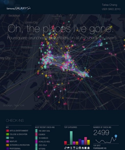 Теперь, каждый желающий получил возможность отслеживать историю своих перемещений с помощью специальной интерактивной карты, начиная с самого первого чекина. Кроме того, инфографика Time Machine содержит специальные столбцы и графики, позволяющие отслеживать время совершения отметок пользователем, а также видеть наиболее часто посещаемые места. Вся информация собирается и обрабатывается в автоматическом режиме на основе анализа активности пользователя. Интерактивная карта, представленная в виде инфографики, доступна для публикации в социальных сетях.