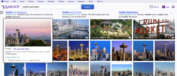 11 июля 2013 года поисковая компания Yahoo запустила обновлённый поиск по картинкам географических объектов для пользователей из США. Теперь при обработке запроса, связанного с определённым местом, историческим зданием или страной, Yahoo начнёт предлагать в поиске по изображениям коллекции недавних изображений в хорошем качестве, сделанных лучшими фотографами.