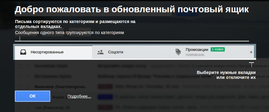 В интерфейсе представлено пять настраиваемых вкладок: Несортированные, Соцсети, Промоакции, Оповещения и Форумы. Пользователи почты могут оставить только те вкладки, которые нужны, или отключите их все. Сортировку сообщений можно «обучить»: если какое-то сообщение попало не в ту категорию, его можно «перетащить» в нужную вкладку.