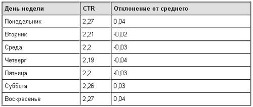 Андрей Иванов, руководитель проекта Нейрон и создатель сервиса Advse.ru назвал лучший и худший день недели для контекстной рекламы в рунете. Андрей поделился ссылкой на статью, где, по данным исследований североамериканского рынка онлайн-рекламы, утверждается, что «лучший день недели для кликов (в контекстной рекламе), безусловно, пятница, с ее абсолютным рекордом, превышающим среднее «будничное» значение CTR почти на 4%». Он также отметил, что средний CTR поисковой рекламы равен примерно 2,2%, т.е. «превышение» аж почти на 4% повысит CTR с будничного 2,2%, до заоблачного 2,2*1,04 = 2,288%, на целых девять сотых процента.