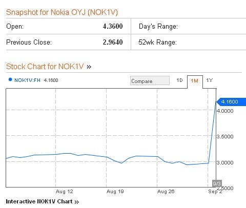 Как сообщает агентство Bloomberg, сегодня утром, 3 сентября 2013 года, стоимость акций компании Nokia на бирже в Хельсинки возросла на 48%, составив 4,36 евро за штуку. При этом, общая капитализация бизнеса компании увеличилась до 16,2 млрд. евро.