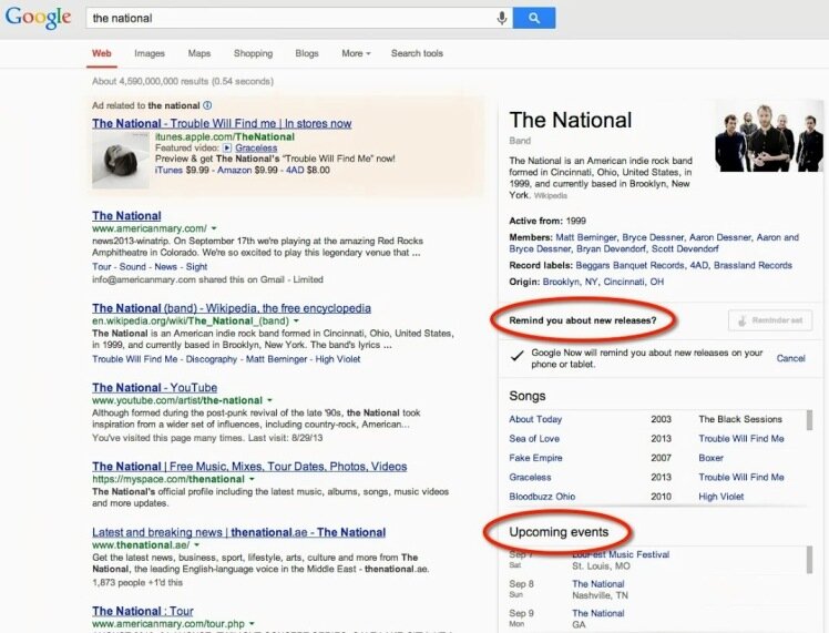 К примеру, если пользователь вводит в поисковую строку Google запрос [The National], то получает возможность мгновенно увидеть точные даты, время начала концертов и города, в которых пройдут выступления группы в ближайшее время. Кликнув по ссылке, с названием концерта, пользователь попадает на новую страницу с результатами выдачи Google, содержащей информацию конкретно об этом мероприятии, а также стоимости и наличии билетов на него.