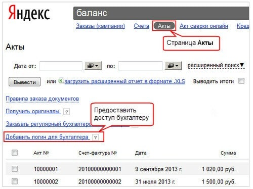 Для получения доступа бухгалтеру нужен отдельный логин на Яндексе. Этот логин нужно указать в Балансе на странице Акты.
