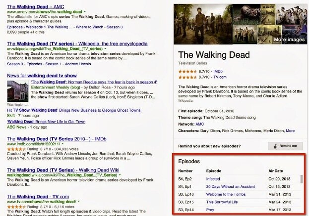 «Теперь, когда вы ищете информацию о вашем любимом телевизионном шоу, вы можете обнаружить гораздо больше сведений о его отдельном эпизоде. К примеру, если вы захотите узнать, когда начнётся следующий сезон телешоу «Ходячие мертвецы». Попробуйте ввести следующий поисковый запрос: [the walking dead tv show] ([ходячие мертвецы телешоу]) и вы сможете увидеть список абсолютно всех эпизодов ТВ-шоу в правом нижнем углу выдачи.