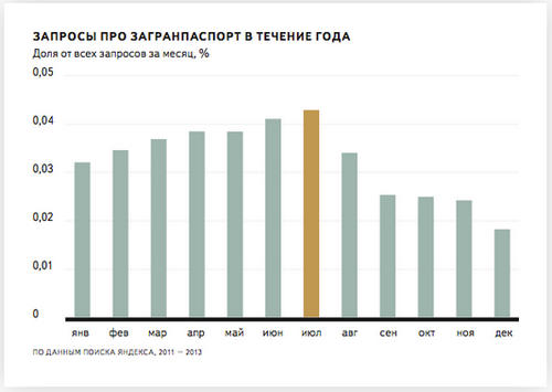 Что же касается времени запросов, то как выяснилось, к заграничным поездкам люди предпочитают готовиться в начале года. В первой половине - с января по июль - запросов про загранпаспорт заметно больше, чем во втором полугодии: