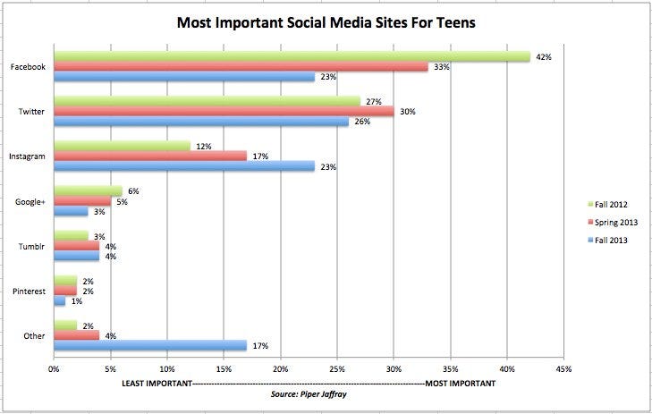 В качестве «основной» социальной сети Twitter назвали 26% опрошенных подростков. Только 23% назвали Facebook; что почти в два раза ниже зарегистрированного максимума в 42%. Еще одним популярным среди подростков ресурсом является принадлежащий Facebook Instagram. Его назвали «выбором №1» 23% опрошенных, что практически в два раза больше, чем год назад (12%).