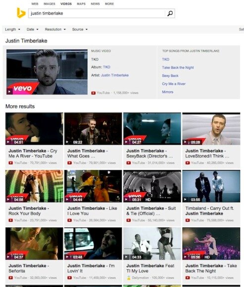 Как сообщается в официальном блоге Bing, 11 ноября 2013 года поисковик от Microsoft представил обновлённую страницу результатов для музыкальных видеоклипов.