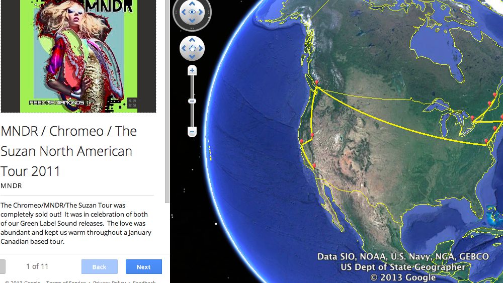Для понимания возможностей Tour Builder пользователь может просмотреть рассказы, уже созданные другими. Одна из историй, к примеру, рассказывает о концертном туре группы MNDR от Торонто до Лос-Анджелеса на Google Earth. При помощи Tour Builder пользователи могут просмотреть фото с концертов группы и прочитать рассказ о каждой пункте остановки.