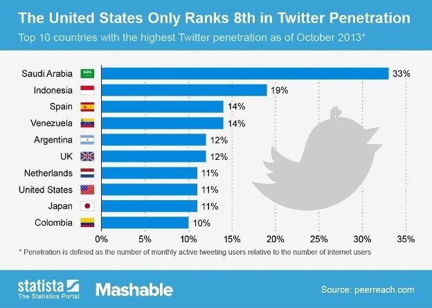 Еще одним любопытным наблюдением стало то, что наиболее активными пользователями Twitter’a стали жители Саудовской Аравии – на их долю приходится 33% пользователей, регулярно публикующих записи в своих лентах.