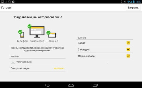 В новом мобильном Браузере реализована синхронизация данных между устройствами, позволяющая пользователю начать работу на одном устройстве и продолжить на другом. В этой версии реализована синхронизация закладок, виджетов Табло и некоторых других элементов.