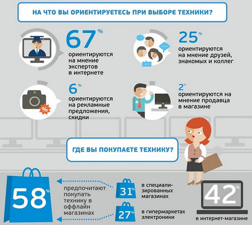 Согласно опросу Hi-Tech Mail.Ru 64% потребителей при выборе техники учитывают мнение специалистов, причем 18% считают, что именно мнение экспертов помогает определиться лучше всего. Примечательно, что 67% опрошенных ориентируются, прежде всего, на мнение экспертов в интернете, 25% – следуют советам друзей, и только 2% доверяют продавцам.