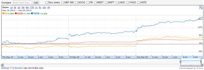 Стоит отметить, что этот год нивелировал неудачи, которые преследовали Facebook после выхода на IPO. За год цена акций компании практически удвоилась. Цена акций Twitter с момента выхода на IPO около месяца назад также выросла почти в два раза.