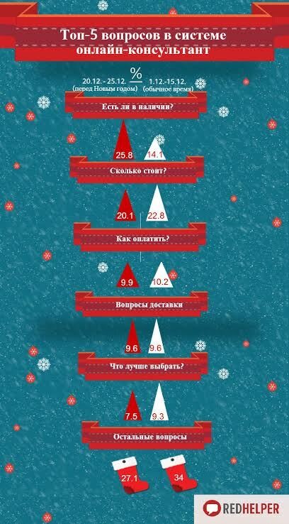 RedHelper также отмечает рост обращений к онлайн-консультированию посетителей интернет-магазинов в предновогодний период. Согласно проведенному автоматическому анализу 100 000 случайных частей диалогов на основе встроенного семантического анализатора диалогов и системы предсказания вероятности обращения в чат со стороны посетителя (RedIndex), в предпраздничное время наблюдается повышение популярности вопроса о наличии товара. Его задают в два раза чаще, чем обычно. Популярность остальных вопросов падает.