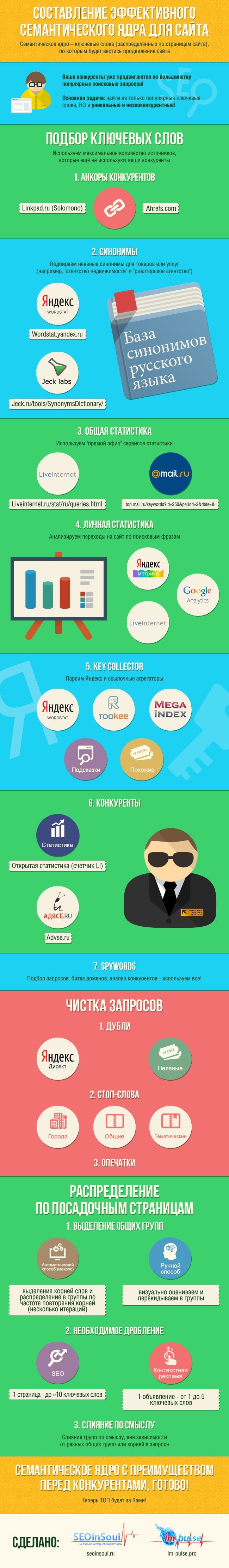 В увлекательной инфографике, приводятся как традиционные, так и нестандартные методы сбора ключевых слов; рассказывается о принципах их очистки и группировки; даются рекомендации по распределению ключевых слов по посадочным страницам.