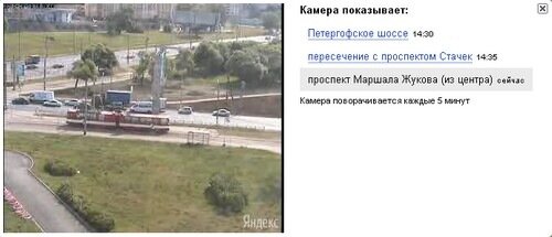 Также на Яндекс.Карте Санкт-Петербурга появились видеотрансляции с улиц города. Каждый желающий может посмотреть прямую трансляцию с любой из более трёх десятков камер, расположенных по всему Петербургу. С их помощью можно увидеть и ситуацию в центре, например, на Сенной площади или Благовещенском мосту, и на окраинах, например, на Гражданском проспекте или Петергофском шоссе.