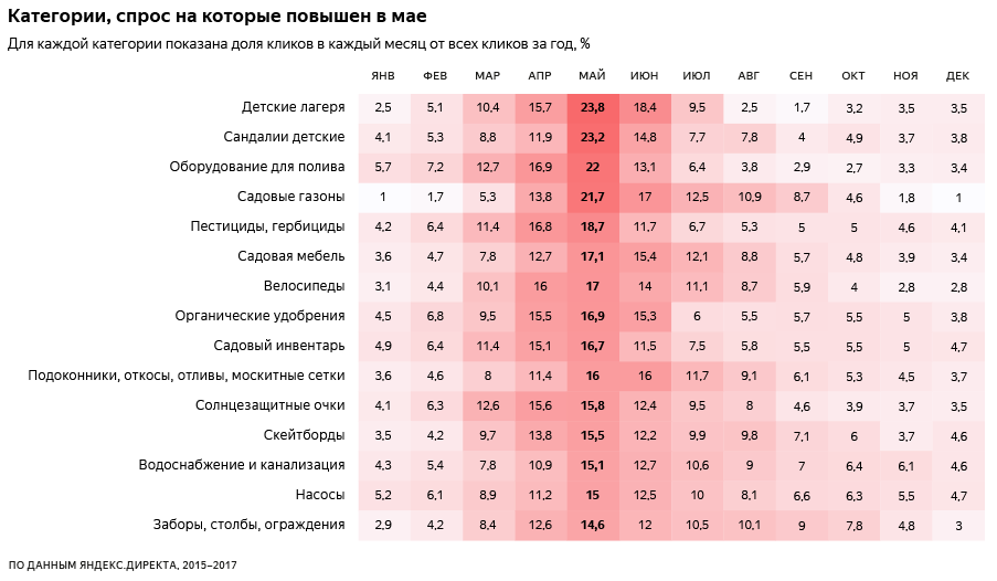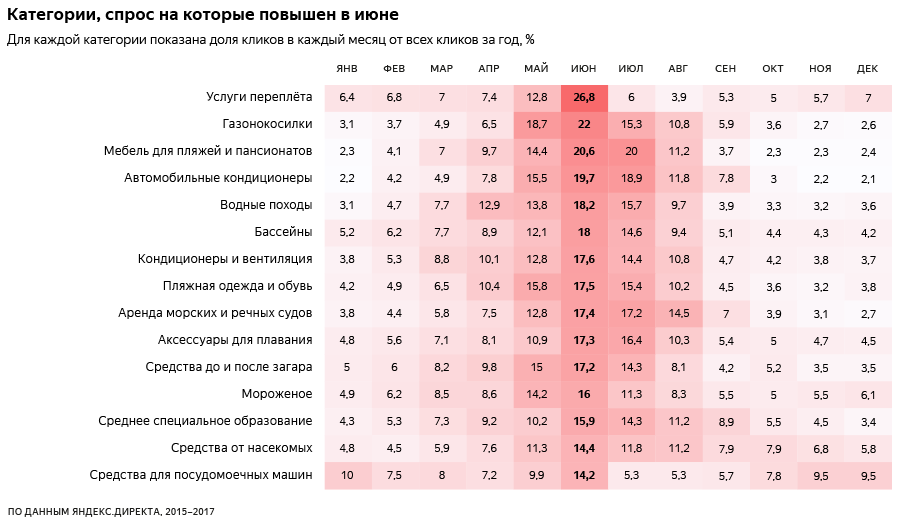 Аналитики Яндекс.Директа изучили данные за 2015–2017 годы и выяснили, какие категории пользовались повышенным спросом с мая по июль. Можно предположить, что в ближайшие три месяца эти товары и услуги снова будут особенно востребованы.