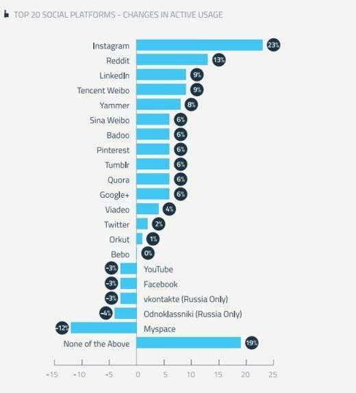 По степени проникновения на мировом онлайн-рынке абсолютным лидером остаётся соцсеть Facebook. В ходе исследования выяснилось, что аккаунты в социальной сети есть у 80% пользователей интернета в возрасте от 16 до 54 лет. Не отстают от конкурента хостинг YouTube и соцсеть Google+ с долей пользователей, приближающейся к 60%.