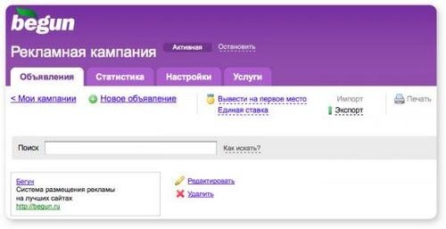 Компания Бегун продолжает непрерывный процесс совершенствования интерфейса рекламодателя. Теперь пользователь может установить единую цену за переход или поднять объявления на первое место, и эти изменения коснутся всех слов и объявлений кампании.